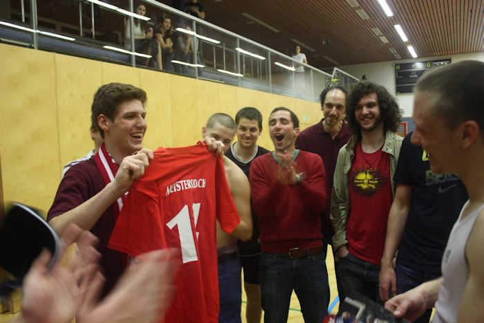 Küken David Graf übergab Meistercoach Michi Traxler das Meistercoachleiberl |