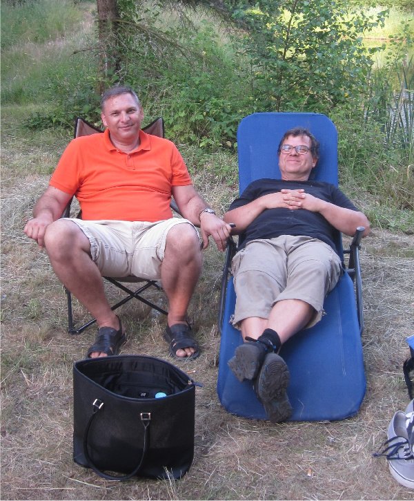 Die Bäuche waren gefüllt, da gab es nur eines - relaxen. Hier die UBBC Legenden Reinhard Ettmüller und Mevludin Sejdic sichtlich zufrieden mit dem Tagesverlauf. Wem von beiden die Handtasche gehört, konnten wir nicht herausfinden. |